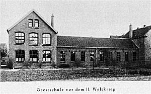 Kaiser- und Kronprinzenstr. Op de Geest, wurde dann aber kurz darauf in Geeststraße umbenannt. Die Gees liegt vorwiegend am Rande eines Höhenrückens. Der Name bedeutet so viel wie ansteigendes, bzw. höher gelegenes, mageres Gelände, welches vorwiegend sandig und steinig ist. Das einklassige Schulgebäude mit dem Namen 'Schule Op de Geest' öffnete am 20.10.1879 seine Tore. Im Laufe der Jahre erweiterte es sich um 5 neu angebaute Klassenräume zu einem 6-klassigen Schulgebäude. |