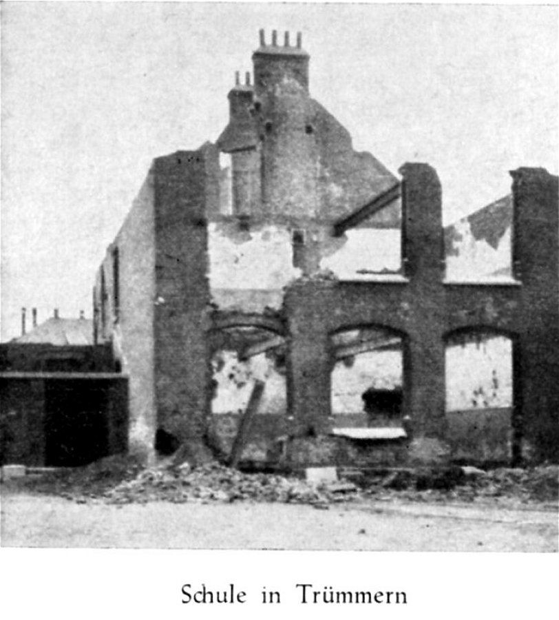 | 22.05.1944 | In der Nacht vom 21. zum 22.05.1944 wurde das Gebäude bei einem Angriff feindlicher Flieger durch Spreng- und Brandbomben zerstört. Dabei ging leider auch die Schulchronik verloren. Die Zerstörung war so schlimm, daß von dem stehengebliebenen Mauerwerk infolge starker Risse für einen Wiederaufbau nicht das Geringste mehr verwendet werden konnte und somit das gesamte Gebäude abgerissen wurde. |