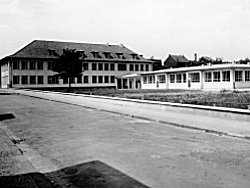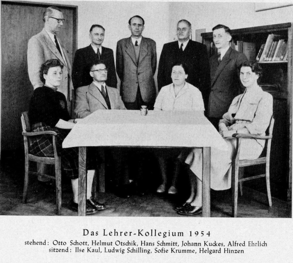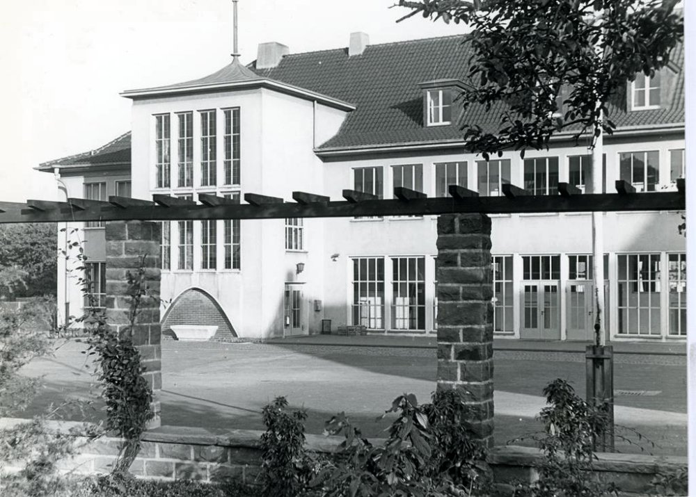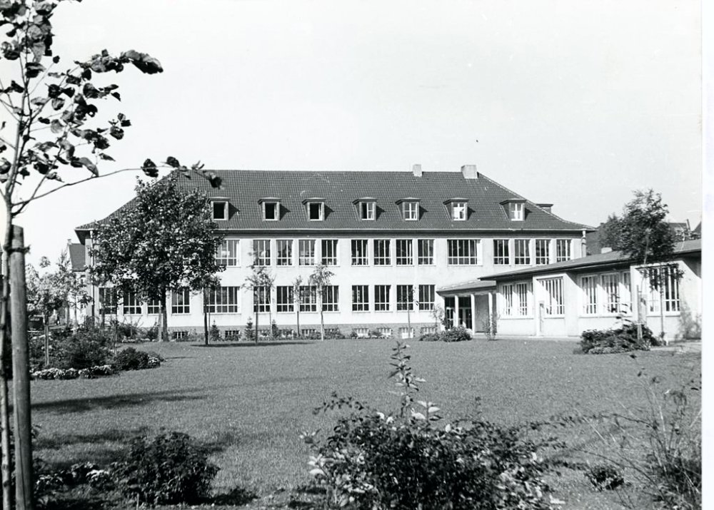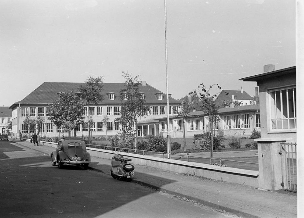 | 17.04.1952 | Am 17.04.1952 konnten Lehrer und Schüler ihren Einzug in das neue Gebäude halten. 400 Kinder in 8 Klassenräumen, dazu im Dachgeschoß ein Festraum mit Sitzgelegenheiten, der auch als Musikraum genutzt wurde. Im Keller befand sich eine Lehrküche mit Essraum. Die Mädchen wurden dort in Hauswirtschaft und Nadelarbeiten unterrrichtet. Für die Jungen gab es Handfertigkeiten im Bastelraum. Längs der Kronprinzenstraße wurde im Anschluß an die Turnhalle ein Pavillonanbau mit 4 Klassen für die katholische Schule erstellt |