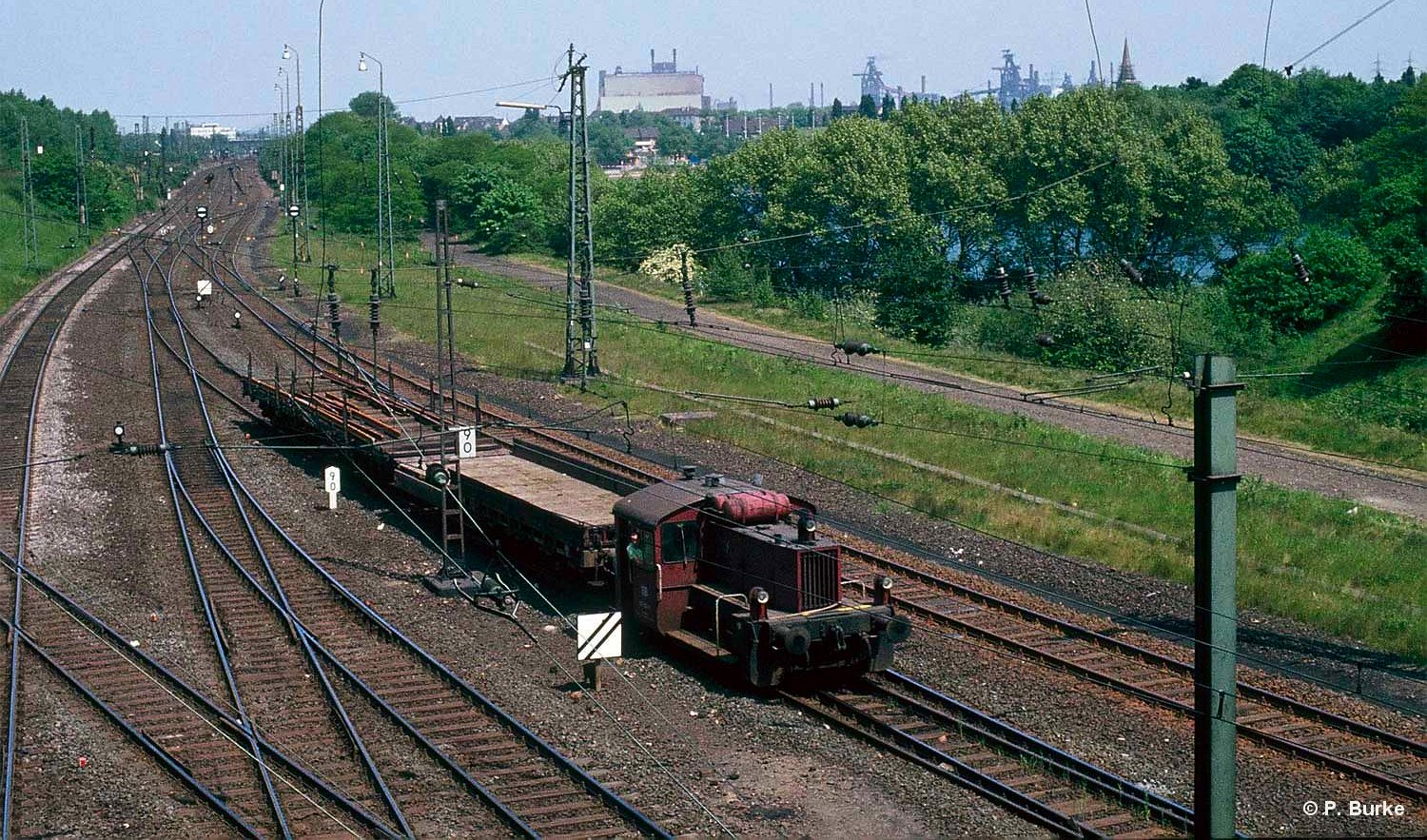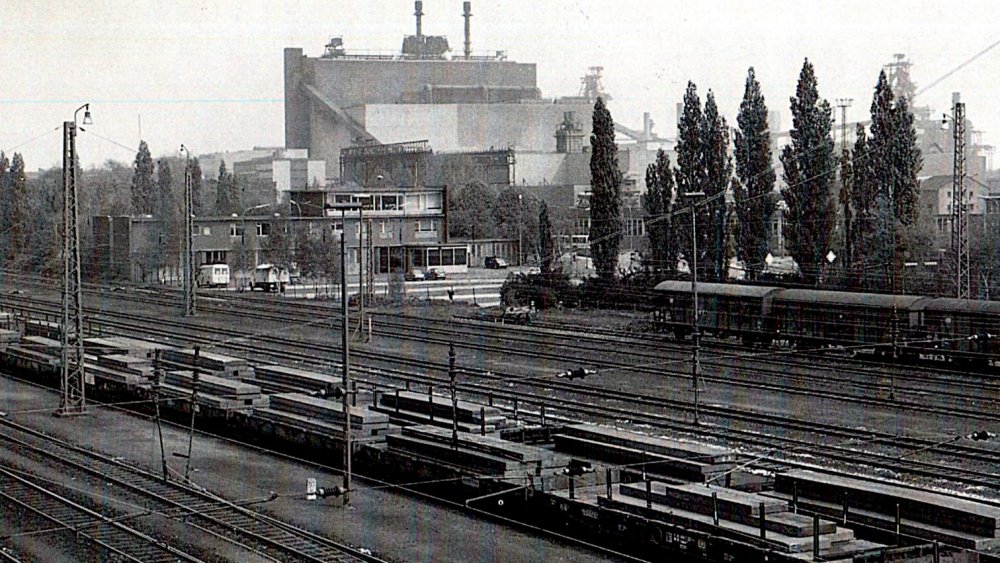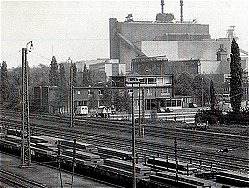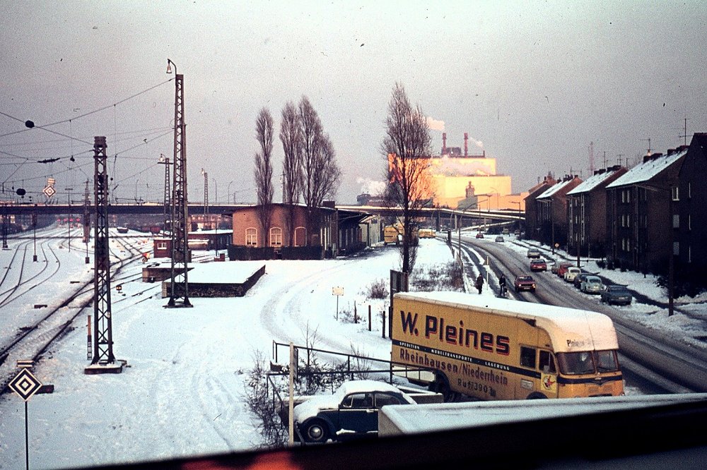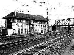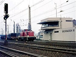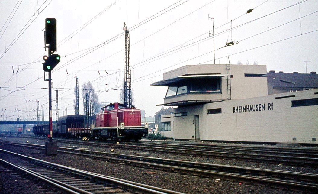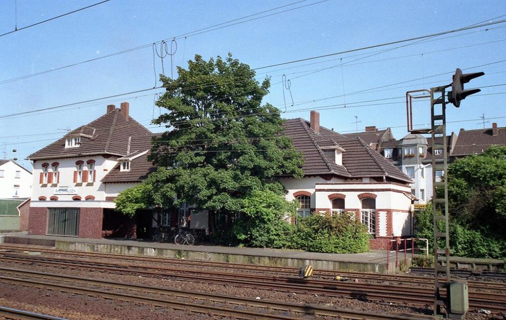 der Strecke nicht aus. Das Stellwerksgebäude "Rmf", Rheinhausen-Mitte-Fahrdienstleiter, in Ziegelbauweise errichtet, war östlich des Bahnhofs zwischen den Gleisanlagen positioniert, wurde 1890 in Dienst genommen und 1973 durch einen Neubau an der Kruppstraße abgelöst.