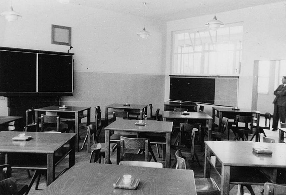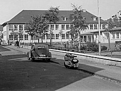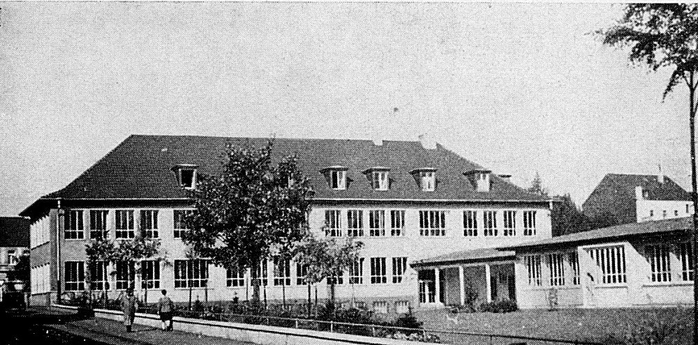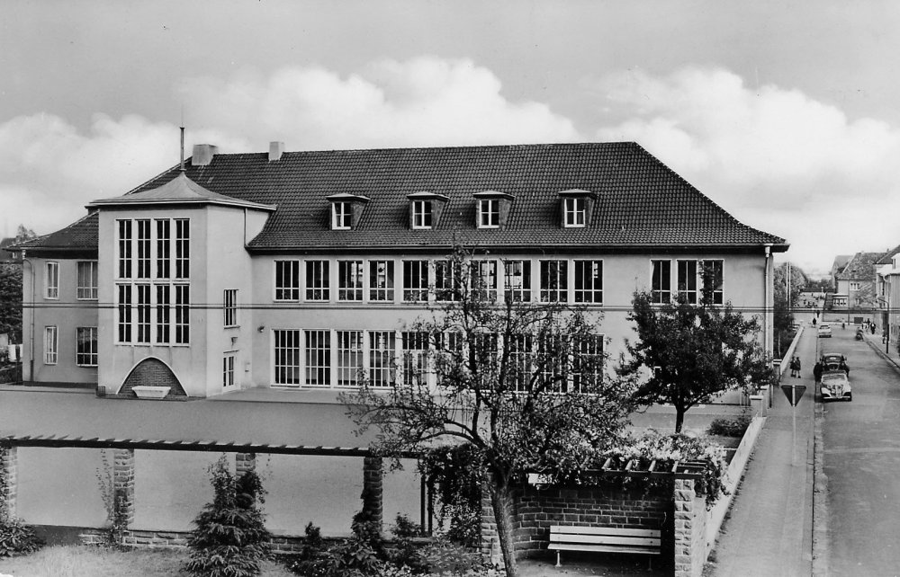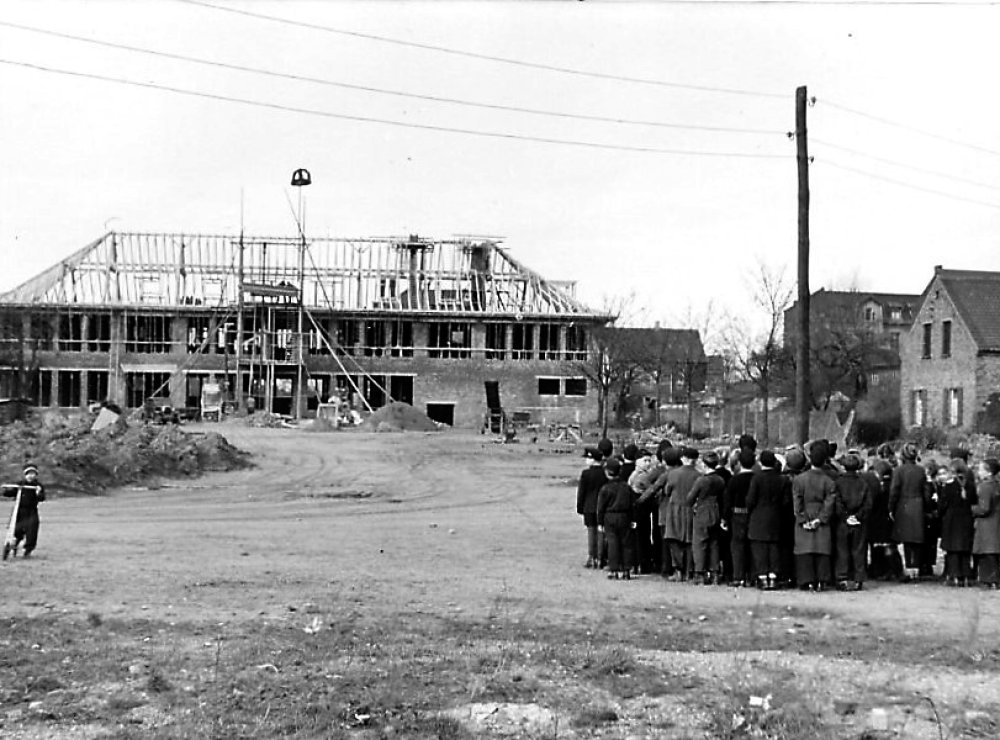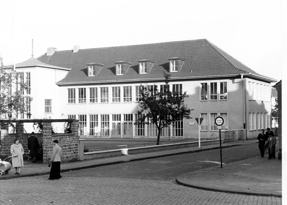 | 17.04.1952 | Am 17.04.1952 konnten Lehrer und Schüler ihren Einzug in das neue Gebäude halten. 400 Kinder in 8 Klassenräumen, dazu im Dachgeschoß ein Festraum mit Sitzgelegenheiten, der auch als Musikraum genutzt wurde. Im Keller befand sich eine Lehrküche mit Essraum. Die Mädchen wurden dort in Hauswirtschaft und Nadelarbeiten unterrrichtet. Für die Jungen gab es Handfertigkeiten im Bastelraum. Längs der Kronprinzenstraße wurde im Anschluß an die Turnhalle ein Pavillonanbau mit 4 Klassen für die katholische Schule erstellt |