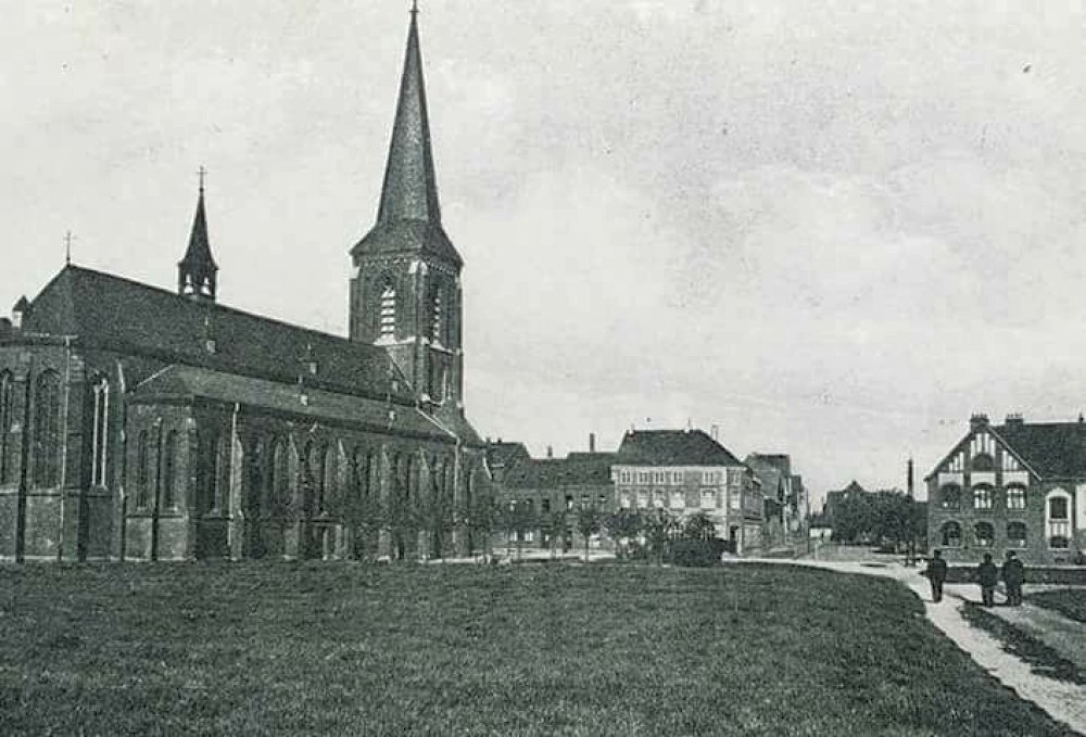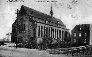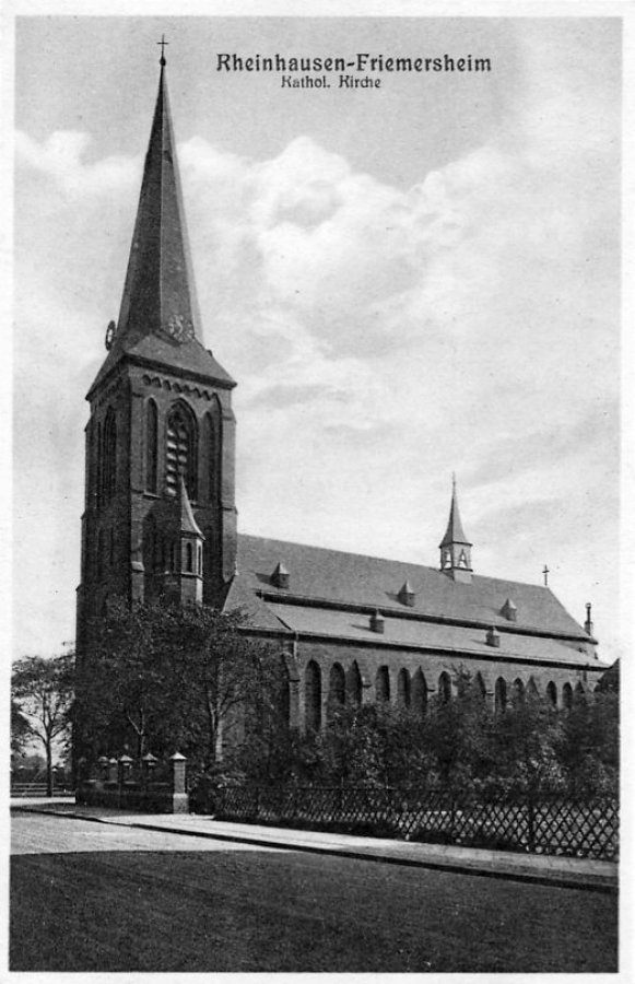 Die Katholiken von Friemersheim gehörten zur Jahrhundertwende zur Pfarre Hohenbudberg. Infolge der sprunghaft anwachsenden Bevölkerungszahl genehmigte der damalige Bischof von Köln, dem Friemersheim damals zugehörte, den Bau einer Kirche für Friemersheim. Baubeginn der Kirche war 1907. Sie wurde in 2 Bauabschnitten fertiggestellt, zunächst 1907 ohne Turm, dann 1914 - 1916 auch der Turm. Der erste Gottesdienst war im gleichen Jahr am 1. Weihnachtstag.